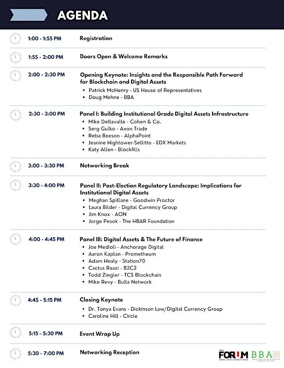This event will delve into the evolving regulatory landscape following the U.S. Presidential election alongside the latest strategies to navigate the related ongoing unknowns. Throughout this half-day event, we will explore a diverse range of product developments and related use cases from real-world asset tokenization to decentralized finance, and analyze the ongoing transformative impact of blockchains and digital assets on the financial landscape.